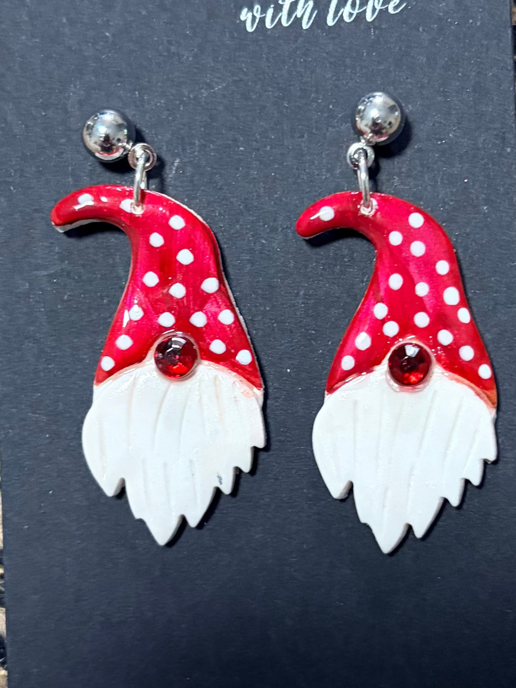 Handcrafted from durable polymer clay, these 1.5 inch gnome earrings feature a whimsical gnome design with a stunning red crystal nose. Perfect for adding a touch of charm to any outfit. Silver post.