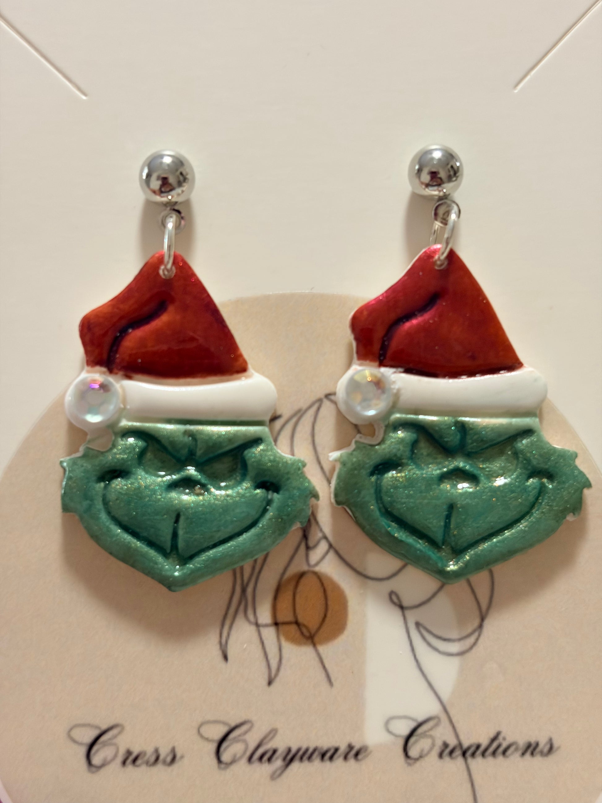 These unique Grinch clay earrings are handcrafted with high-quality polymer clay, featuring iridescent green and red colors that catch the light. Measuring one and a half inches in length, they are lightweight and comfortable to wear. The earrings are finished with silver ball post for a touch of elegance.