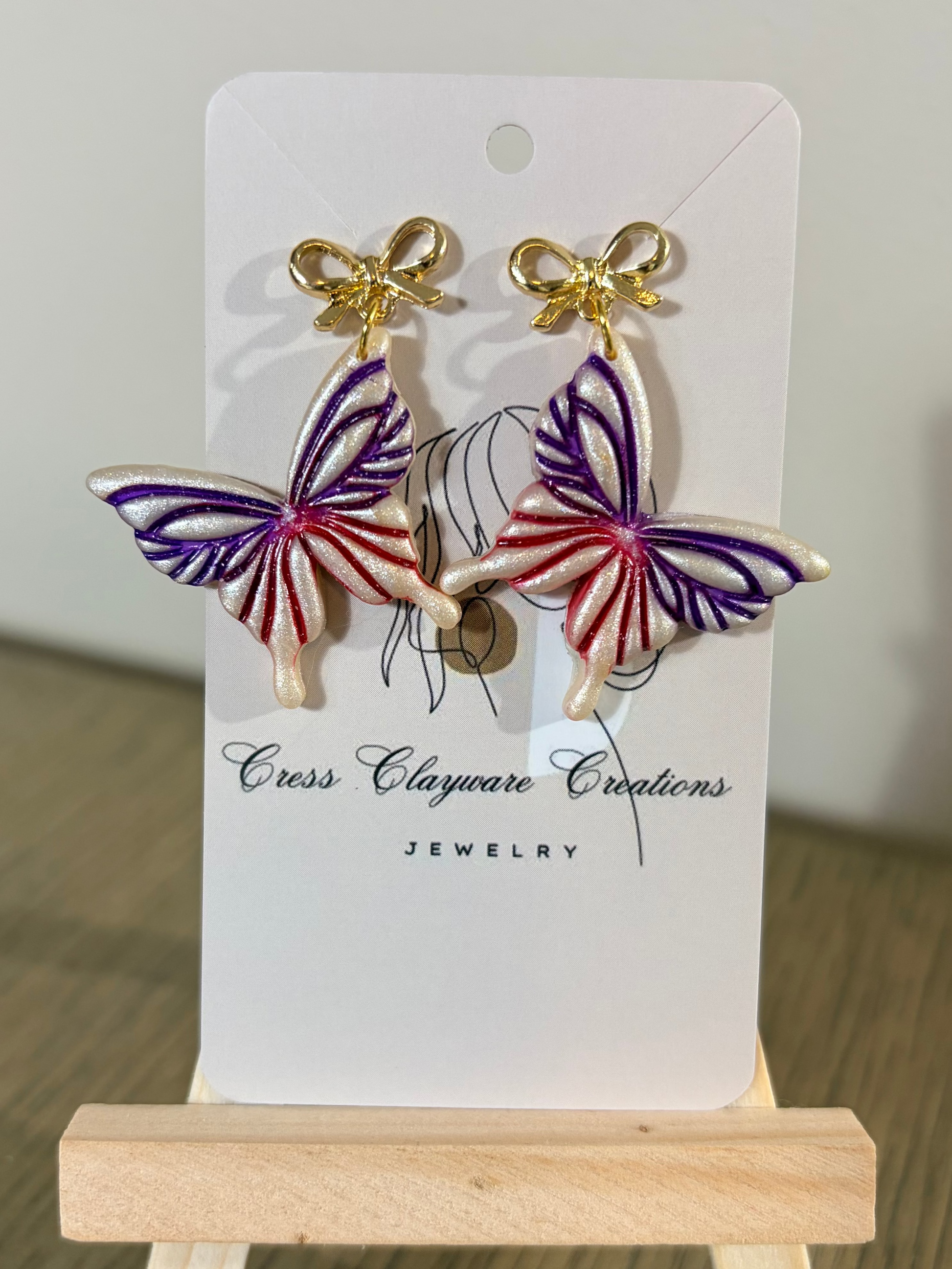 The Spring Butterflies with bow feature iridescent red and purple butterflies crafted from durable polymer clay. Each butterfly measures approximately one and a half inches and gracefully hangs from a delicate gold bow. This design not only adds elegance but also enhances visual interest in various decorative settings.