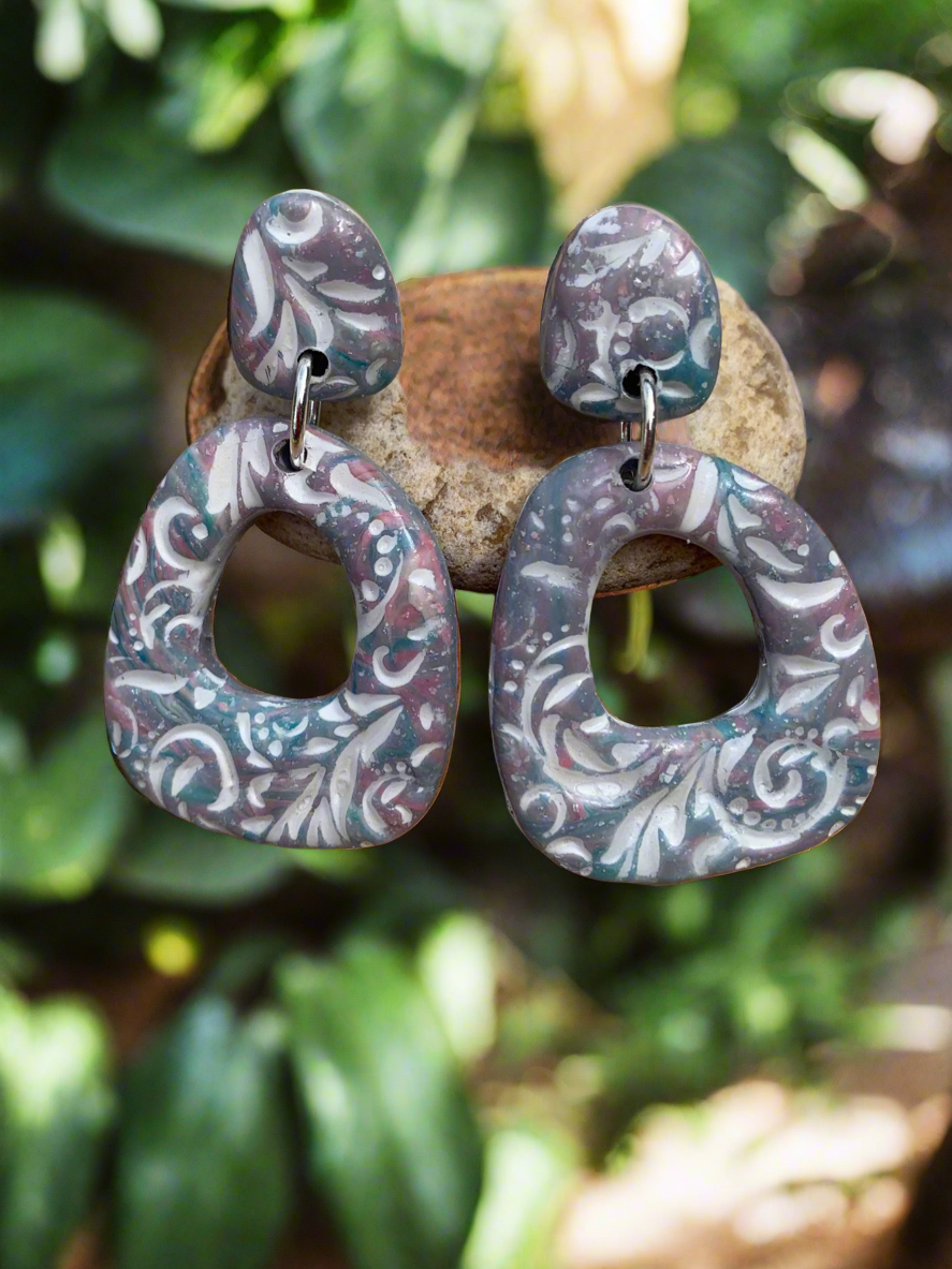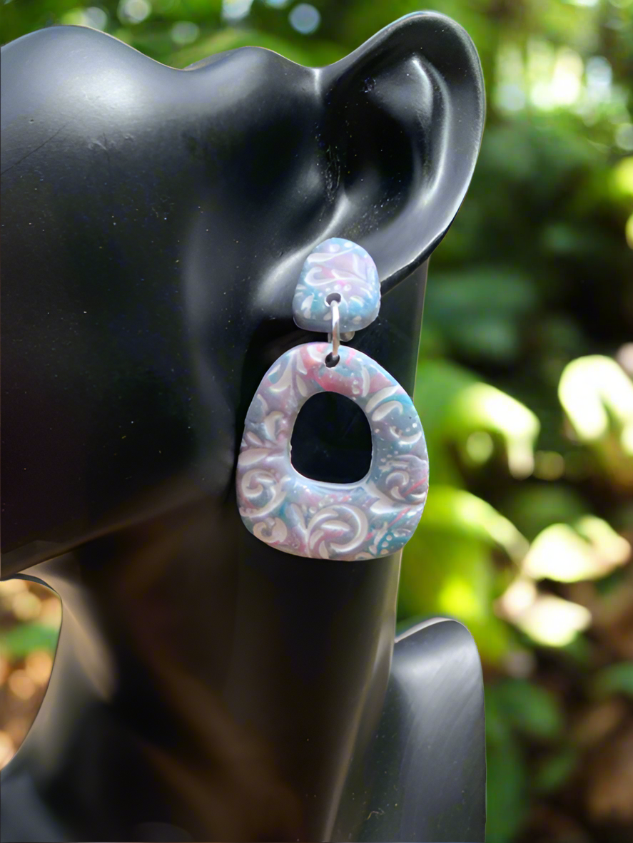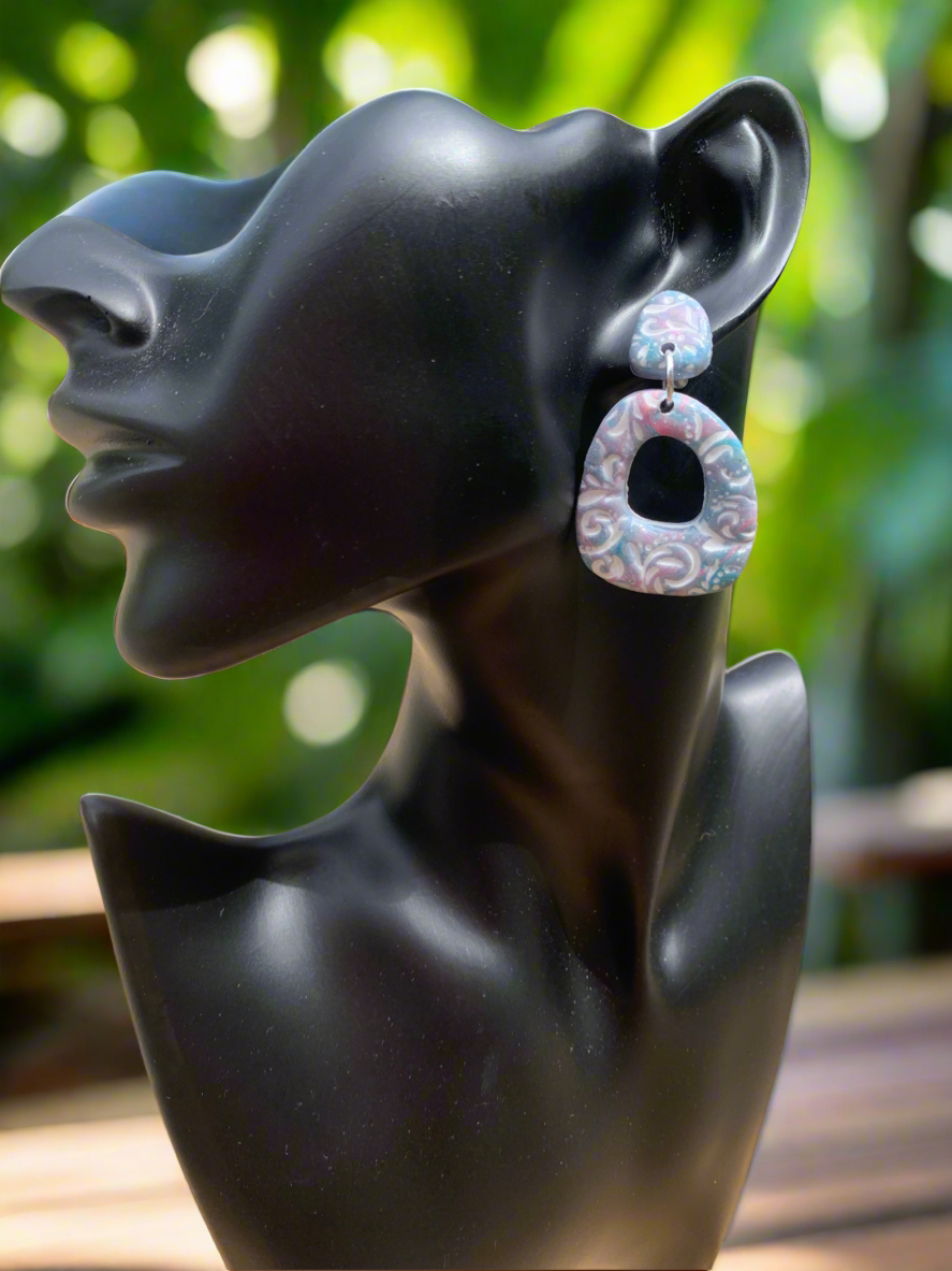 Get ready for some boho beach vibes with our lightweight polymer clay earrings. The embossed print features a mix of pink, blue, and white shades, perfect for adding a pop of color to your summer look. With a 2 7/8 inch length, these earrings are sure to make a statement without weighing you down. (You won't want to take them off!)